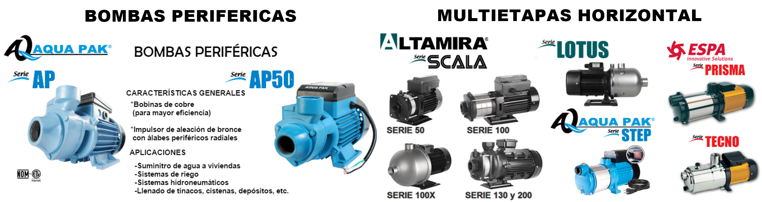 Las bombas centrífugas de superficie tienen un campo de aplicación muy amplio, tanto en instalaciones residenciales domésticas, como en instalaciones comerciales, industriales, agricultura y ganadería . Dentro de este tipo de bombas de superficie se encuentran las bombas periféricas, bombas tipo jet, centrifugas horizontales y bombas multietapas horizontales y verticales. Algunas de las aplicaciones más comunes para este tipo de bombas son los sistemas hidroneumáticos de uso doméstico y comercial, llenado y vaciado de depósitos, riego residencial, plantas purificadoras de agua, etc.