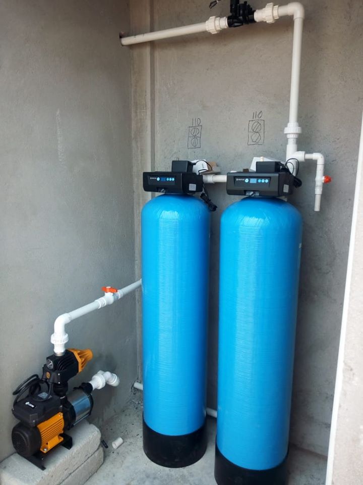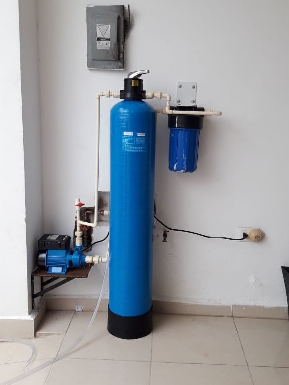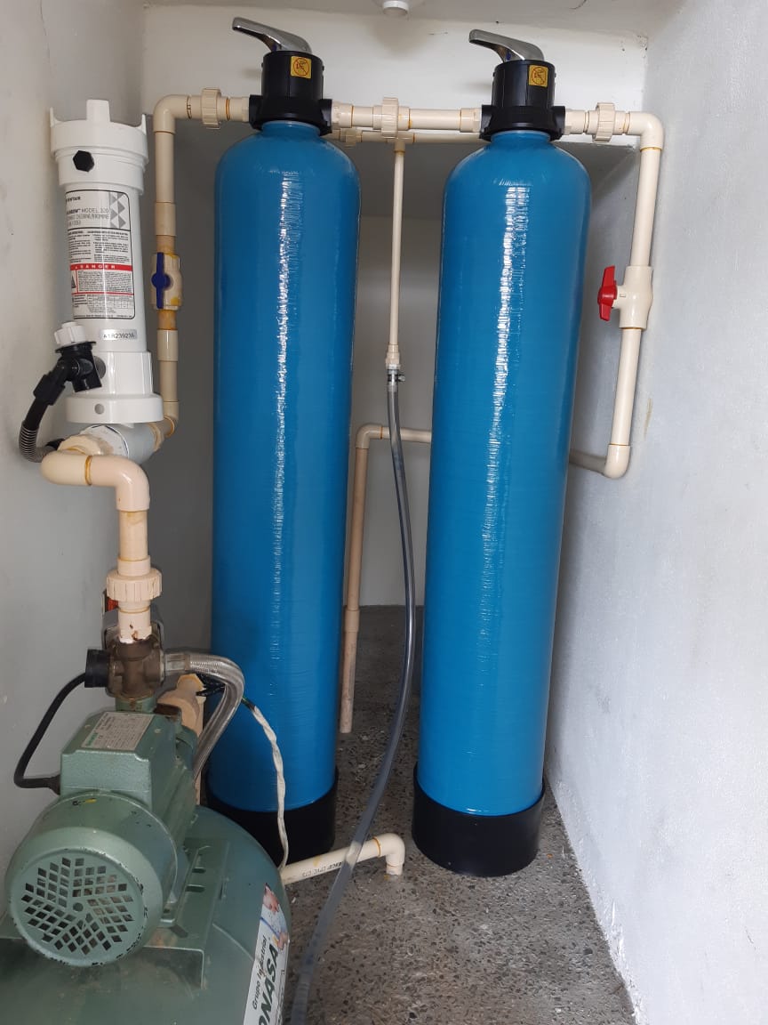 Equipo de tren de filtración para retención de sedimentos y sabor del agua con válvula automática, presurizado por una bomba sumergible controlada por un swich digital para su correcto funcionamiento.